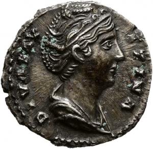 Vorderseite: DIVA FAV-[S]TINA. Drapierte Büste der Diva Faustina (maior) mit hochgebundenen Haaren nach rechts. Perlkreis.